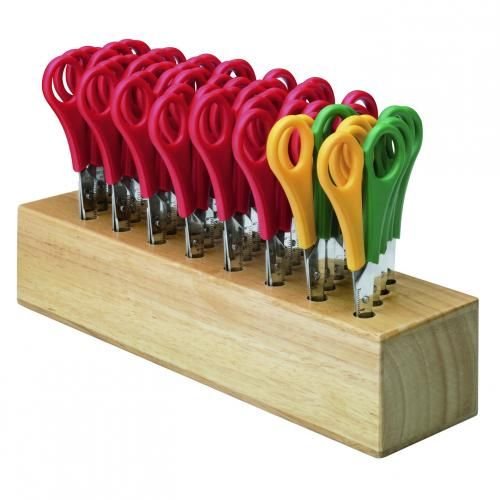 Ideal for classroom use, this Westcott Wooden Scissor Block comes with 32 pairs of scissors; 26 red for right handed users and 6 yellow and orange for left handed users. The scissors have a rounded, blunt tip for safety and are great for arts and crafts use for children aged 4 and over.